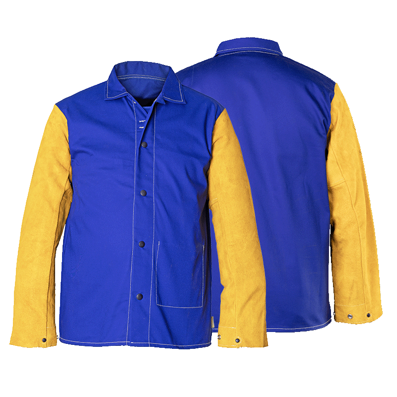 雄蜂王Yellowjacket焊服提供上身清爽舒適,全臂抗燒焊飛濺物,手臂由抗火、隔熱又耐磨的牛二層皮制成;衣身由305g/m2可洗水的防火阻燃棉布制作,安全舒適,是一款CE認證產品。前胸配置防焊飛濺護條,可防止燒焊飛濺物濺入衣內;采用隔熱又絕緣的紐扣和鍋釘確保安全;內置工具袋安全又方便;雙層縫邊衣領以及袖口有可調寬緊的紐扣等新穎設計。